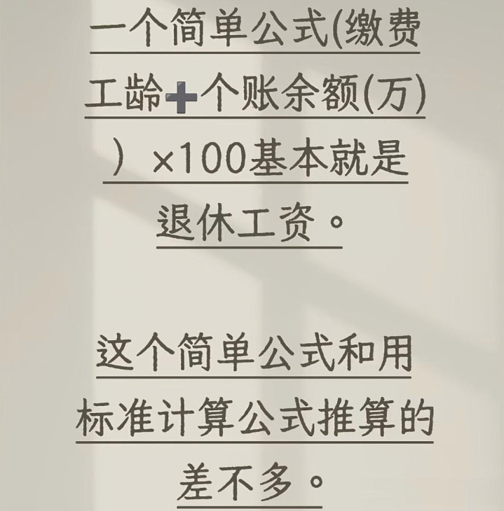 “(缴费工龄 + 个人账户余额(万元))× 100 ≈ 退休工资”。