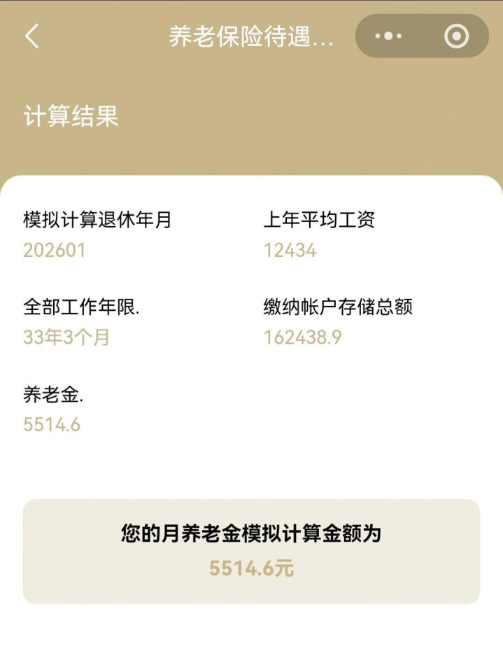 第二张图:工龄33年3个月,个人账户存储额16.2万,测算养老金5514.6元/月。