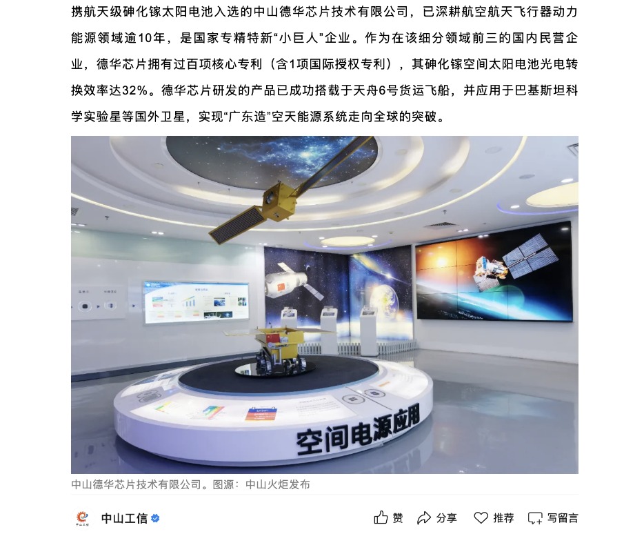 中山市工业和信息化局官微发布的一篇文章曾表示,德华芯片已深耕航空航天飞行器动力能源领域逾10年,是国家专精特新“小巨人”企业。作为在该细分领域前三的国内民营企业,德华芯片拥有过百项核心专利(含1项国际授权专利),其砷化镓空间太阳电池光电转换效率达32%。